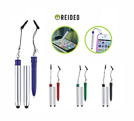 Bolígrafo Plástico "Touch-Screen" con tapa plateada y goma posterior negra para pantalla táctil. Incluye práctico soporte plástico para insertar en la salida de auricular del iPhone. Escritura azul.