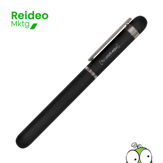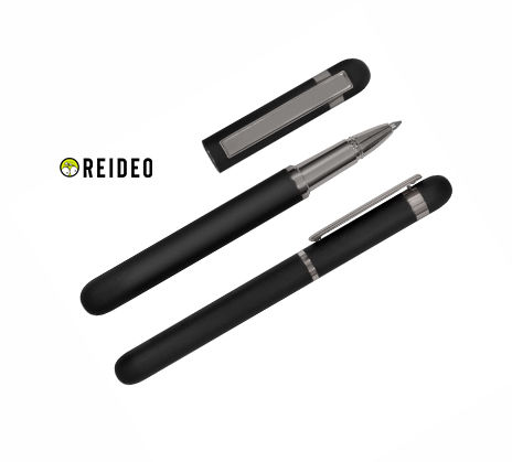 Metal. Cuerpo de aluminio. Bolígrafo roller. Apertura con tapa a presión. Clip y anillos metálicos color plata. Tinta Negra. Decapa color plata tanto en el cuerpo como en la tapa. Presentación en estuche con cierre magnético.