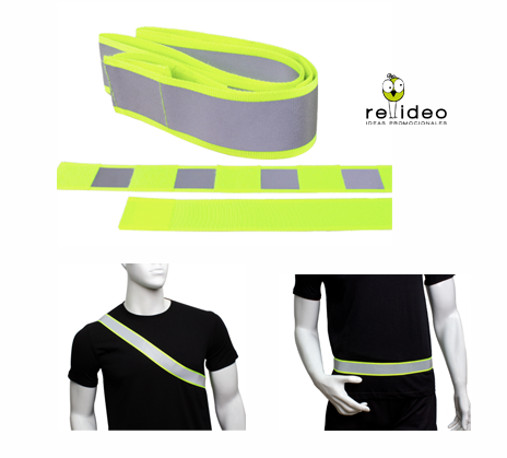 Banda (cinta) elástica reflectante para hombro y cintura, con 5 ajustes de velcro. Se puede usar como banda presidencial o como cinturón. Viene en práctica bolsa de polipropileno con orificio para colgar en ganchera.
