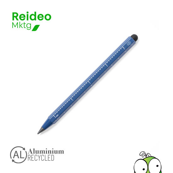 Lápiz eterno multifunción fabricado en aluminio reciclado. Funciones lápiz, puntero táctil y regla, con medidas en centímetros (11) y pulgadas (4). Reutilizable y con escritura infinita, para así usar siempre el mismo lápiz y no generar residuos. Con distintivo aluminio reciclado y disponible en variada gama de colores. El aluminio reciclado es un material con posibilidades de reciclaje casi infinitas, sin perder sus propiedades originales y consumiendo menos energía en este proceso. 3 Funciones