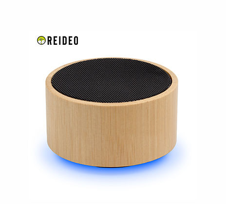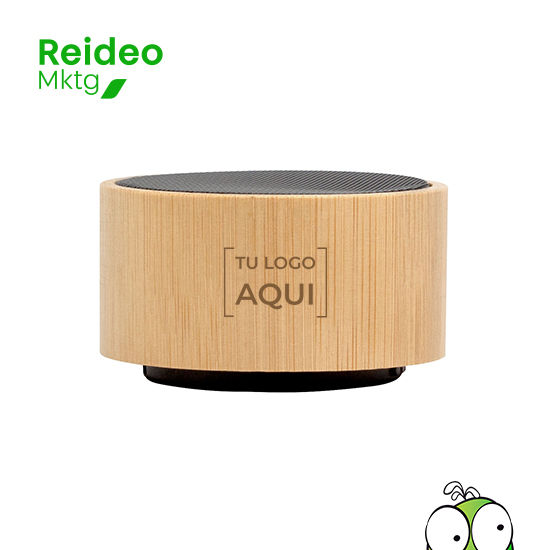 Parlante Bluetooth. Caja redonda de Bambú color natural con malla metálica en la parte superior. Base negra con panel de control. Permite recibir llamadas. Micrófono incorporado. Versión bluetooth: 5.0. Batería: 300 mAh. Potencia: 3W. Cable de carga y conexión USB tipo C en color negro. Presentación en caja de regalo Kraft.