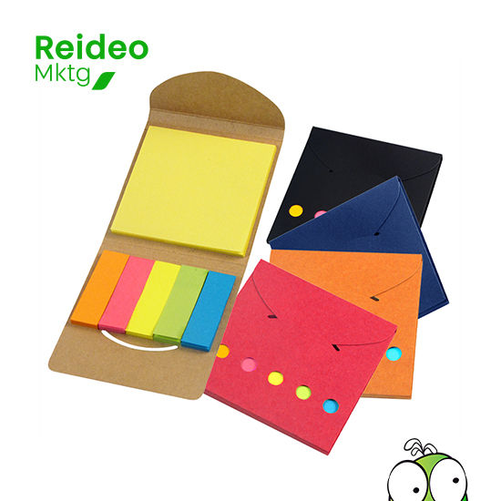 Porta notas adhesivas Ecológico de Cartón reciclado. Incluye 1 taco de notas adhesivas de 25 hojas de 7,5 x 7,5 cm + 5 tacos de 25 banderitas adhesivas de 5 x 1,5 cm.